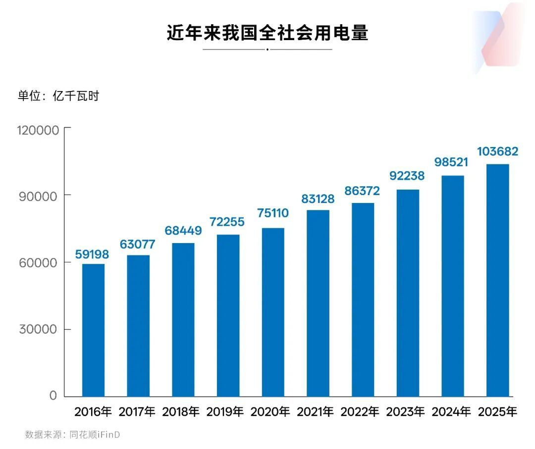 对美国而言,新形势下所面临的挑战在于“电力即算力”。2025年中国全社会用电量达到10.4万亿千瓦时,约占全球总用电量的三分之一,分别是美国的2.3倍、欧盟的3.5倍以上。