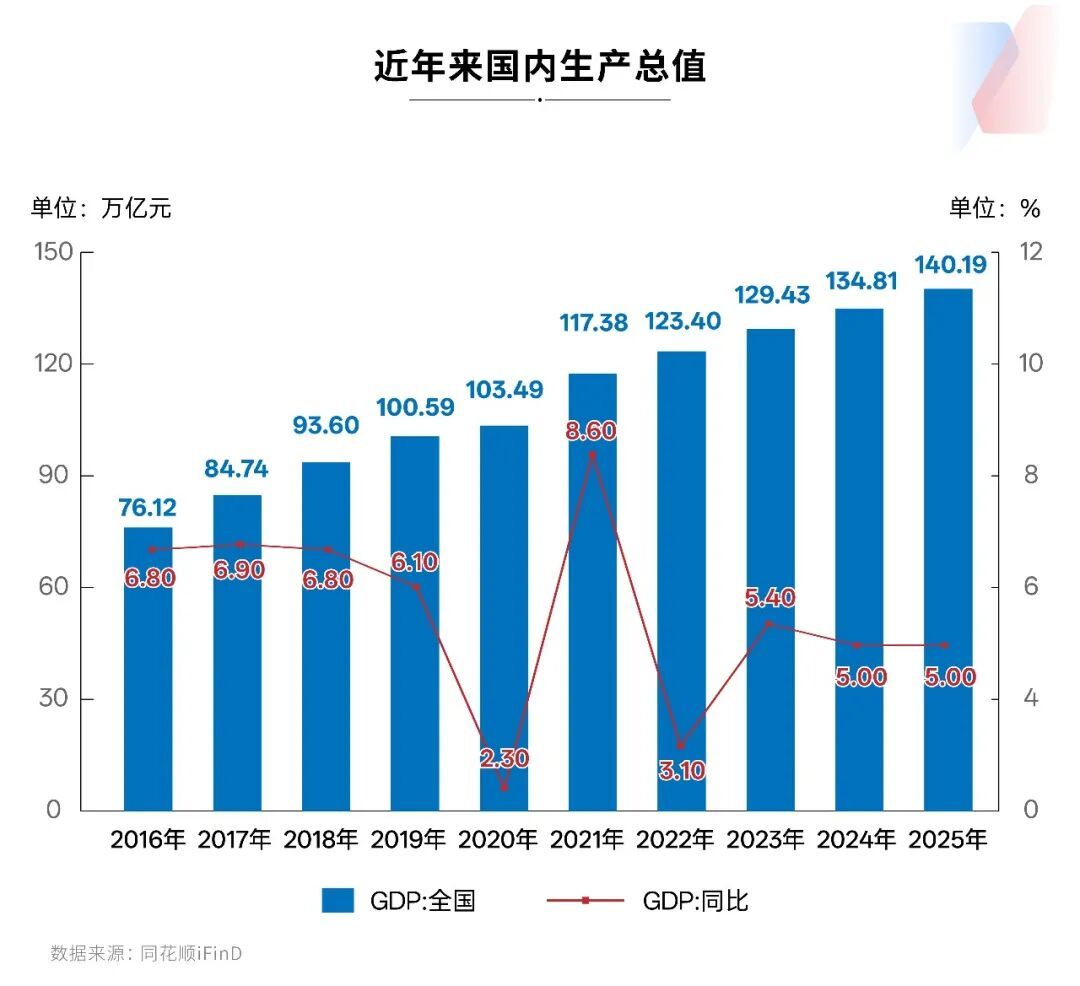 2025年,我国国内生产总值(GDP)比上年增长5.0%,经济总量首次突破140万亿元大关,圆满完成预期目标任务;全国城镇调查失业率均值为5.2%,低于5.5%左右的预期控制目标;货物进出口总额首次突破45万亿元,比上年增长3.8%,有望连续九年居全球首位,成为稳定全球产业链供应链的“关键一环”……